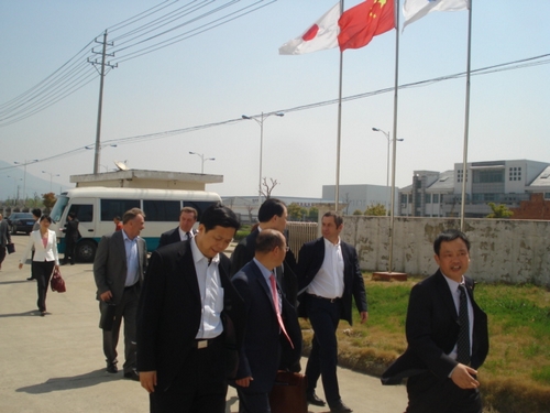 圖為莫夫昌副州長(右2)一行在巢湖嘉誼朱玉倉總經(jīng)理(右1)帶領(lǐng)下參觀工廠