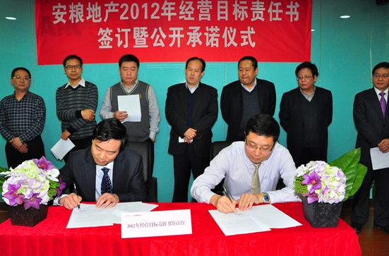 會上,在所有參會人員的見證下,安福、東怡、國合、蘭桂、蕭縣、徐聞、臨沂永信、秀山建設等8個項目公司(部)負責人與宋恩君總經理簽訂了2012年經營目標責任書,并做出公開承諾。