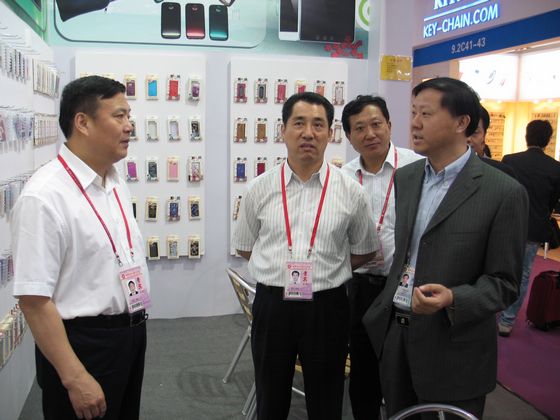 省國資委副主任朱少春(左三)、國貿集團董事長范陽(左二)巡視公司廣交會展位