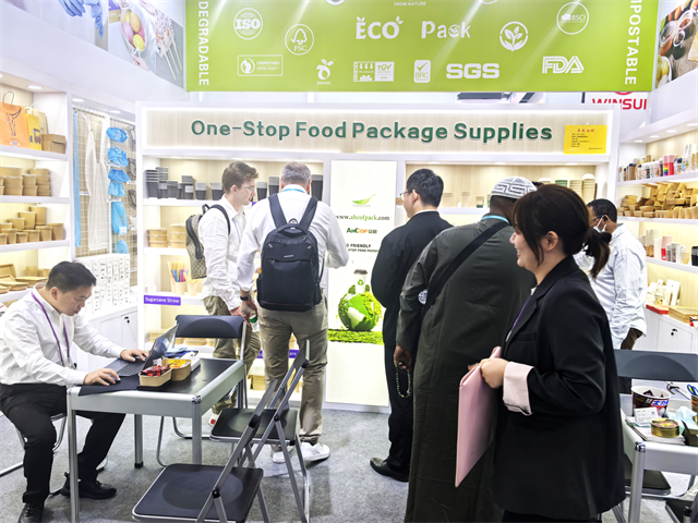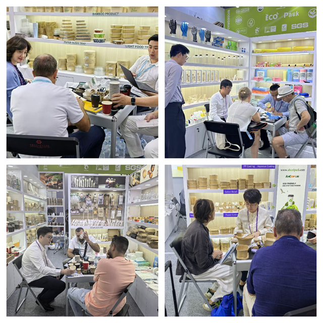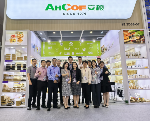 在全球化與個性化的雙重驅動下,消費者對產品的需求日益多樣化。本期會展安糧積極擴充產品規格,豐富產品種類,帶來了深受客戶喜愛的全降解紙杯、紙刀叉、紙質蘸料杯等一次性日用品。尤其是本次推出的以竹、木、甘蔗渣等為原材料的新產品輕食盒,在開展當天吸引了一大批歐美客戶的咨詢。